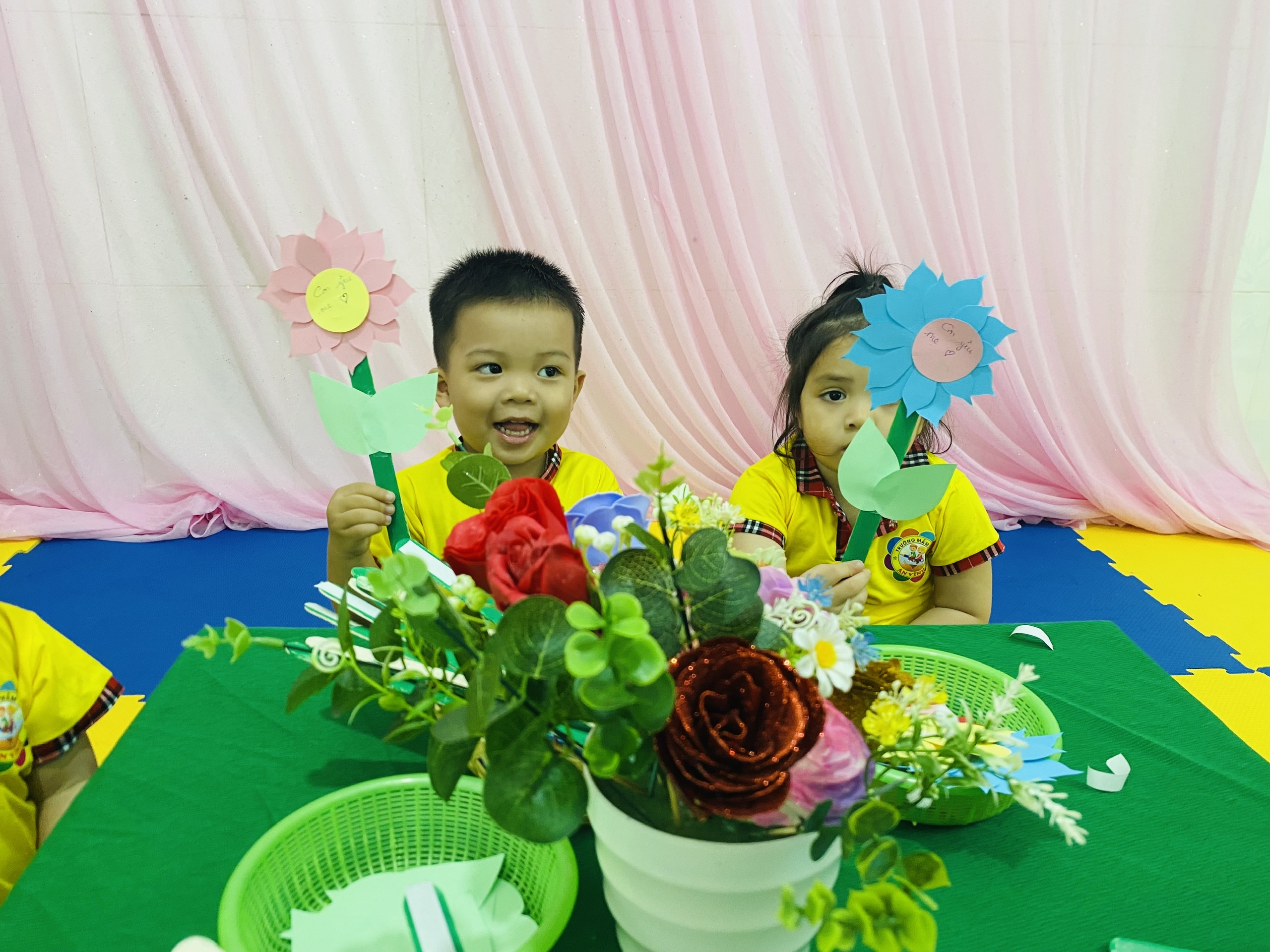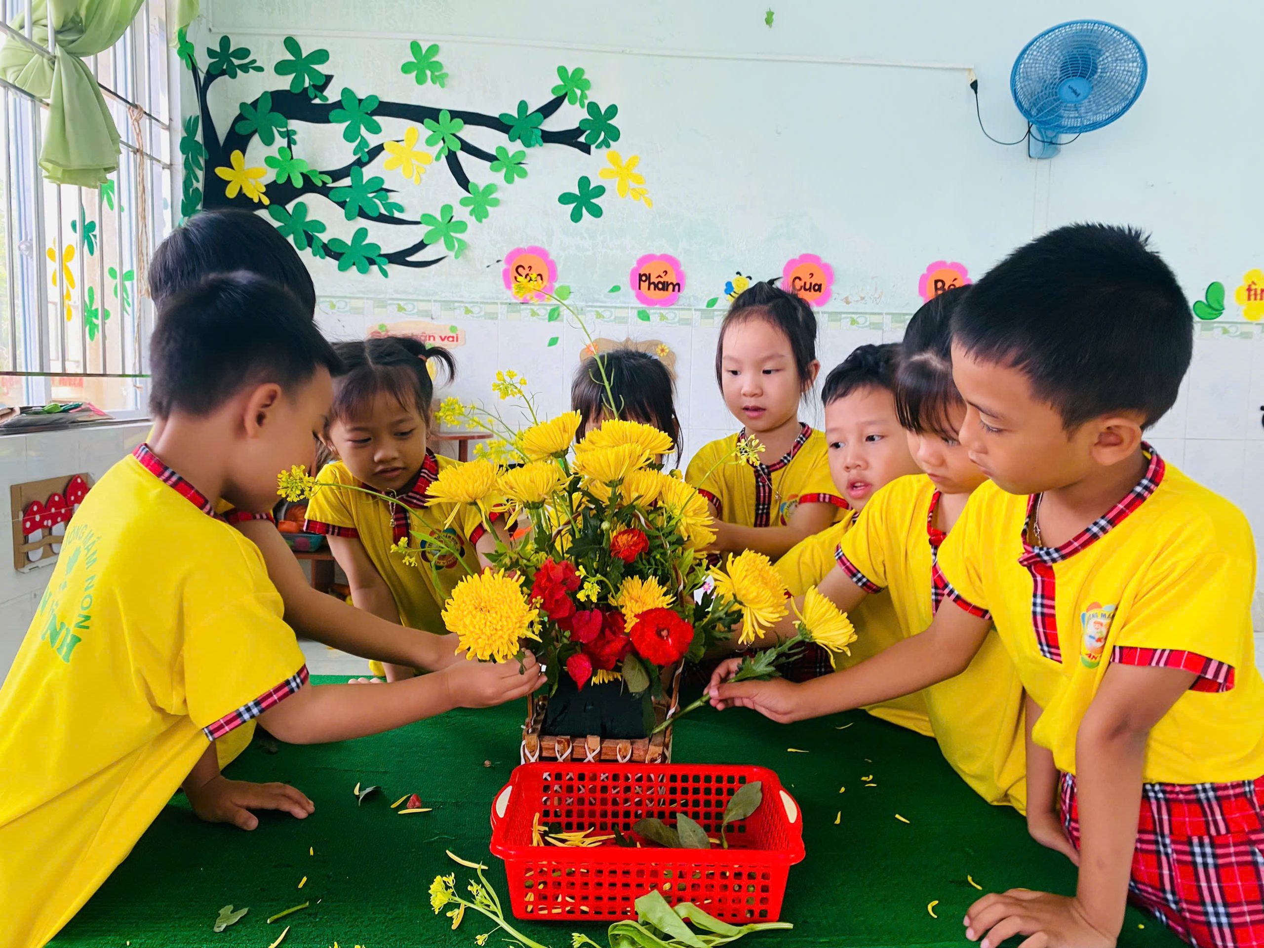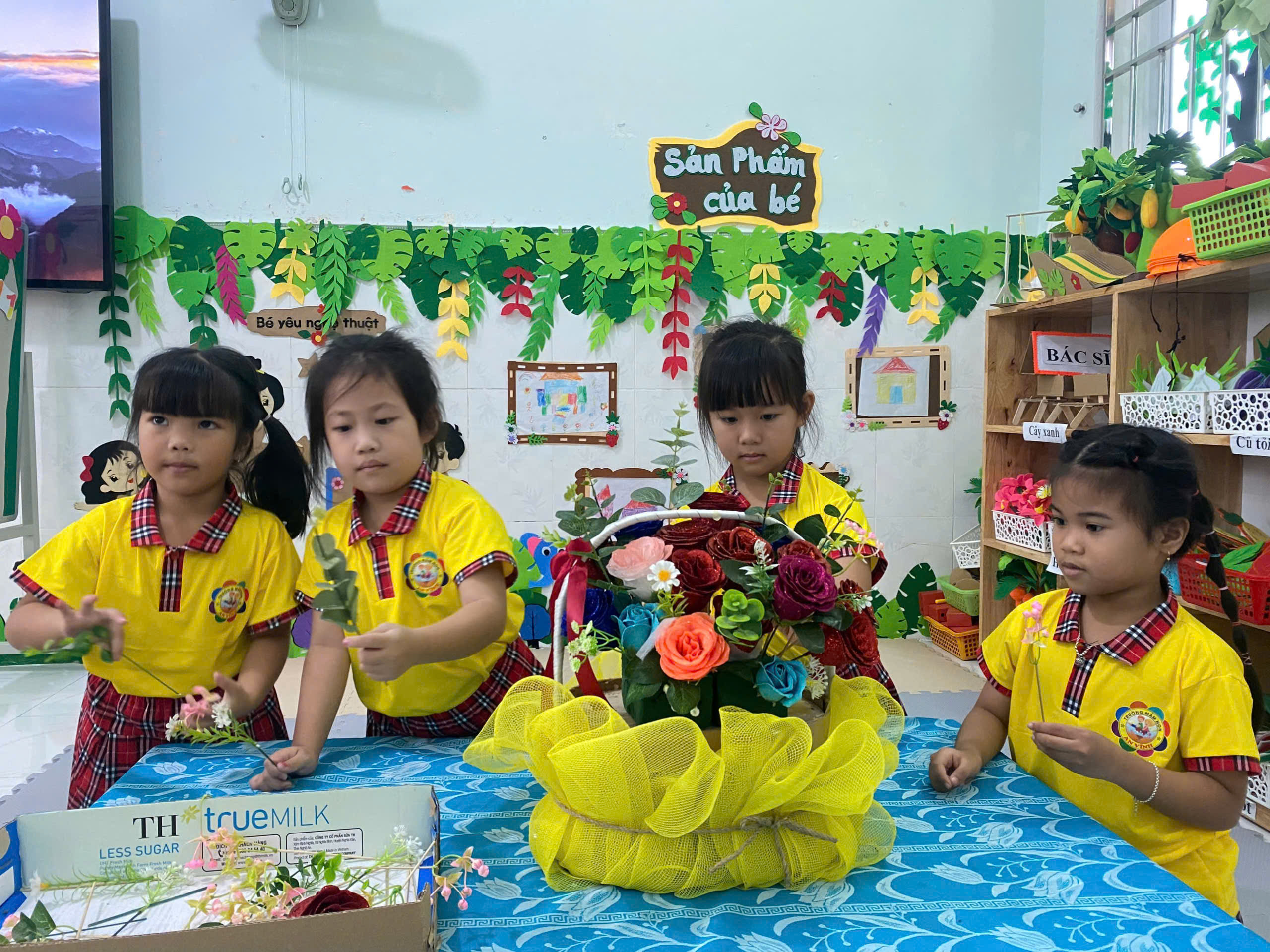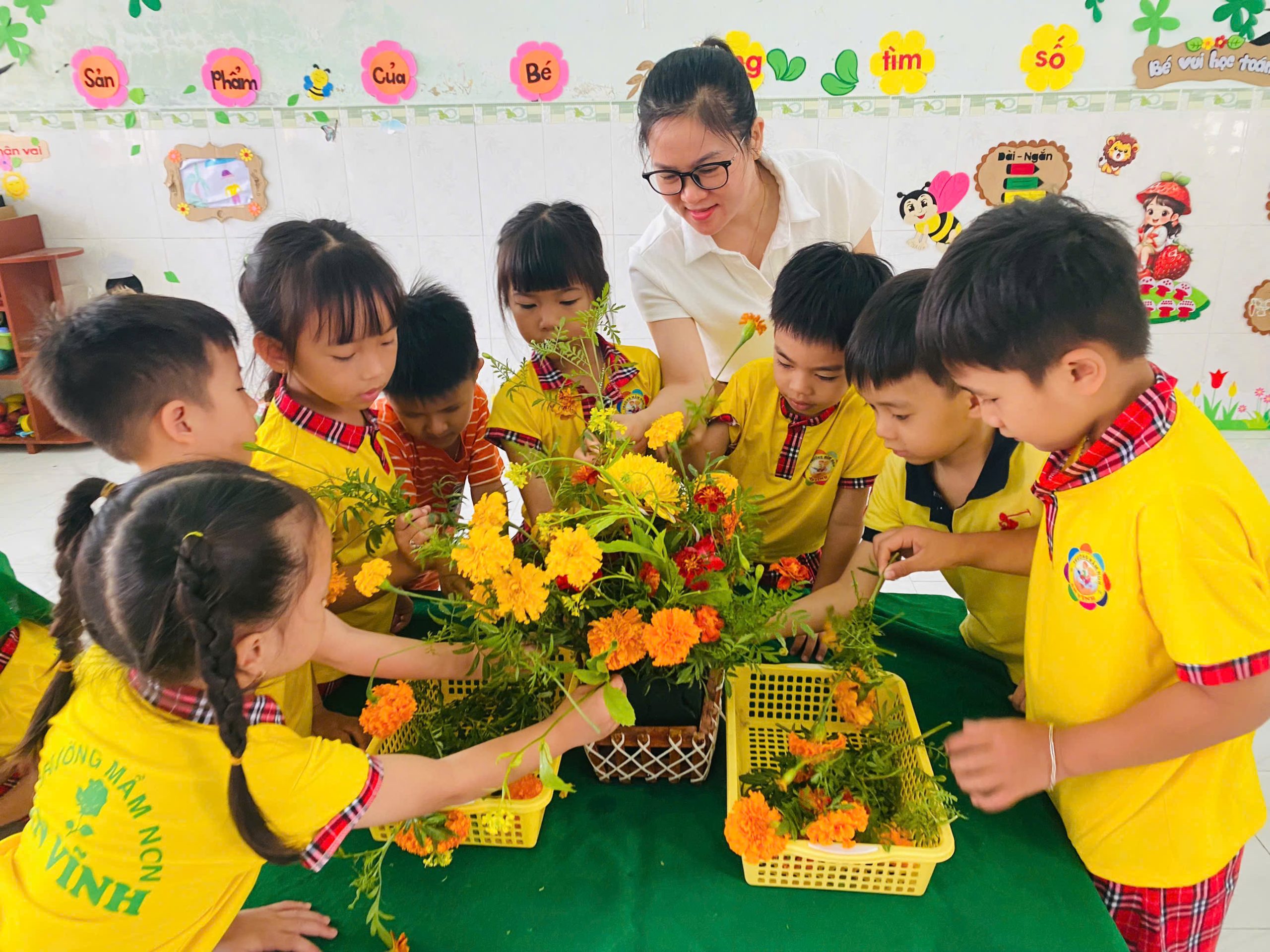 💐 💐 💐 Một trong những hoạt động được các bé rất yêu thích là hoạt động cắm hoa. Dưới sự hướng dẫn tận tình của cô giáo, các bé đã khéo léo lựa chọn những bông hoa tươi đẹp để sắp xếp thành những lẵng hoa xinh xắn. Dù còn nhỏ nhưng các bé đã rất tỉ mỉ và hào hứng khi tự tay hoàn thành sản phẩm của mình. Những giỏ hoa nhỏ nhắn nhưng chứa đựng tình cảm ngọt ngào của các bé dành tặng bà và mẹ nhân ngày đặc biệt này 🍄 🍄