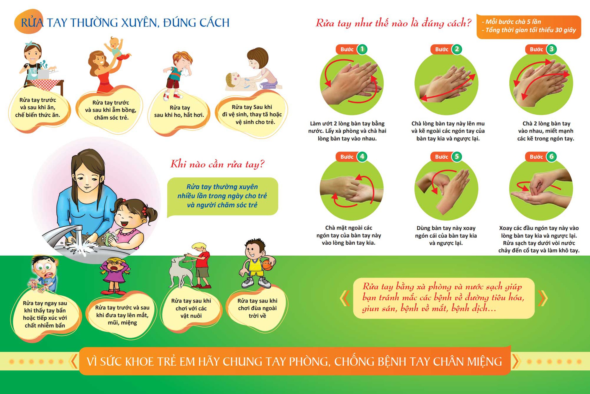 Rửa tay thường xuyên bằng xà phòng dưới vòi nước sạch cho cả người lớn và trẻ, đặc biệt trước khi ăn và sau khi đi vệ sinh.